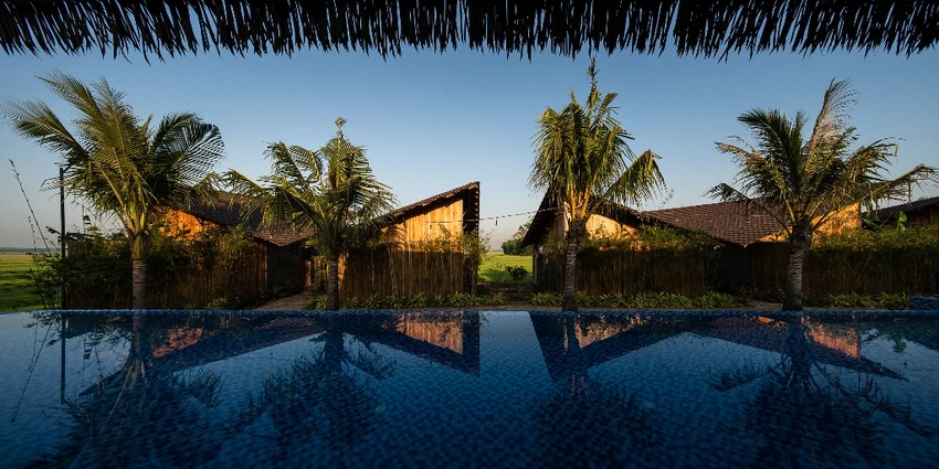 – Khu lễ tân có nhà hàng hồ bơi (nhà hàng và hồ bơi view đồng lúa, lễ tân view ao nội bộ). Hình thức kiến trúc lấyý tưởngmái truyền thống, lợp rơm chống đỡ bởi hệ vì kèo sắt sơn màu. KTS thiết kế tường với các vòm cong nhịp điệu kết hợp với tường đá tự nhiên.