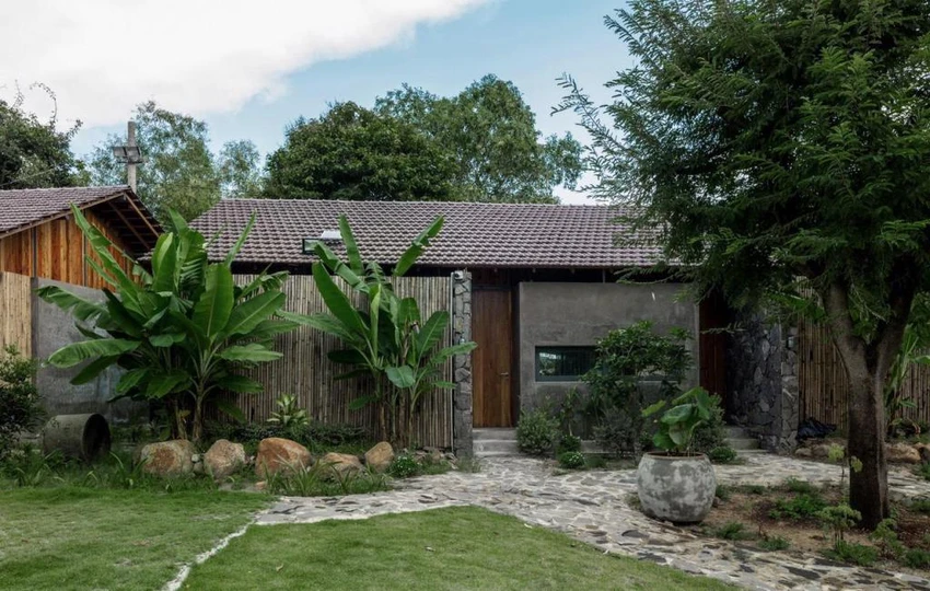 Tất cả các chi tiết liên quan làng quê xưa cũ như mái ngói truyền thống, mái rơm, xà gồ gỗ cây… được đưa vào sử dụng trong hình thức kiến trúc của công trình. Kết cấu công trình từ hệ vì kèo sắt gỗ kết hợp chắc chắn.