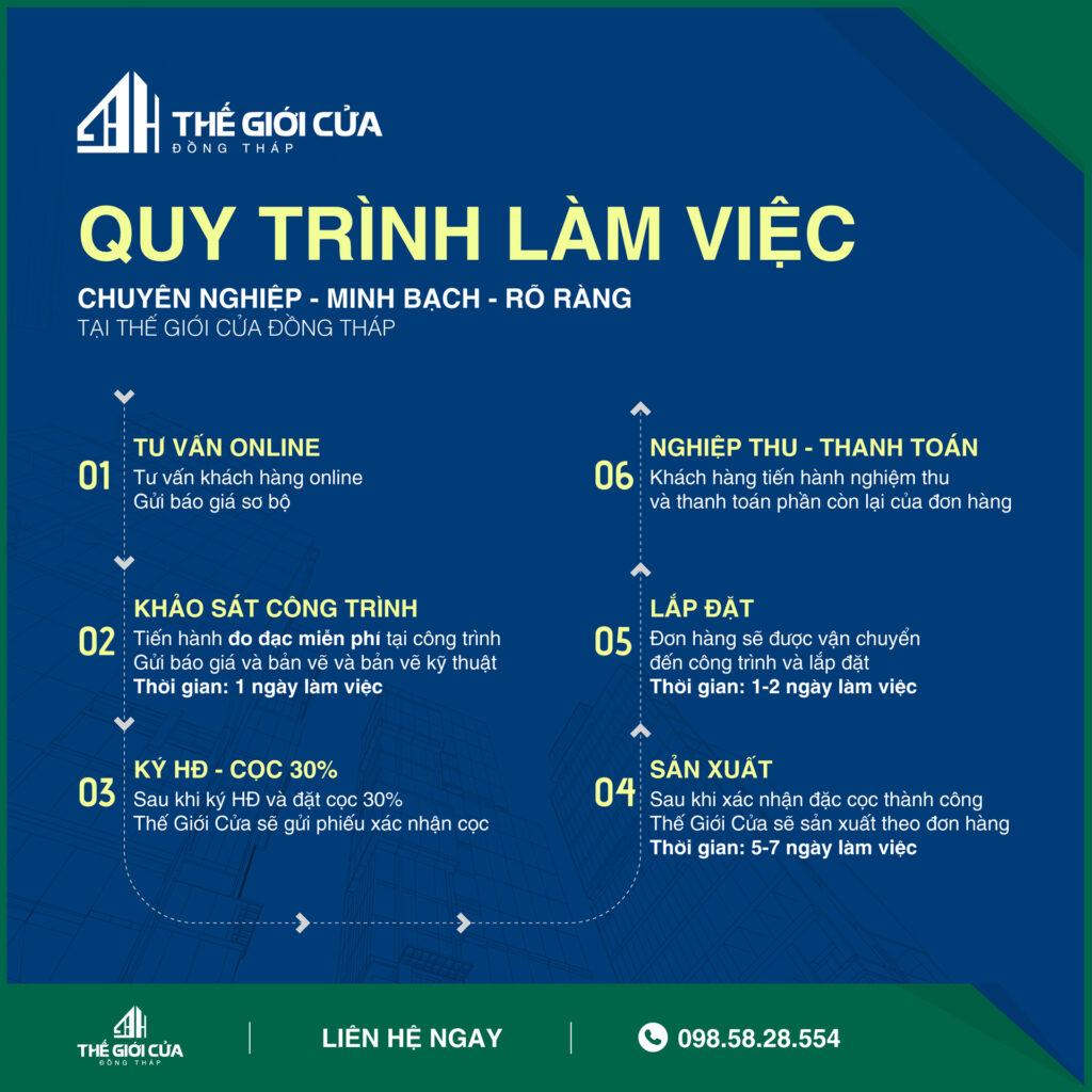 Tại Thế Giới Cửa Đồng Tháp, chúng tôi luôn cam kết mang đến cho khách hàng những sản phẩm và dịch vụ chất lượng với quy trình làm việc rõ ràng, minh bạch và chuyên nghiệp. Dưới đây là 6 bước cơ bản để bạn có thể dễ dàng hiểu hơn về quy trình hợp tác với chúng tôi: